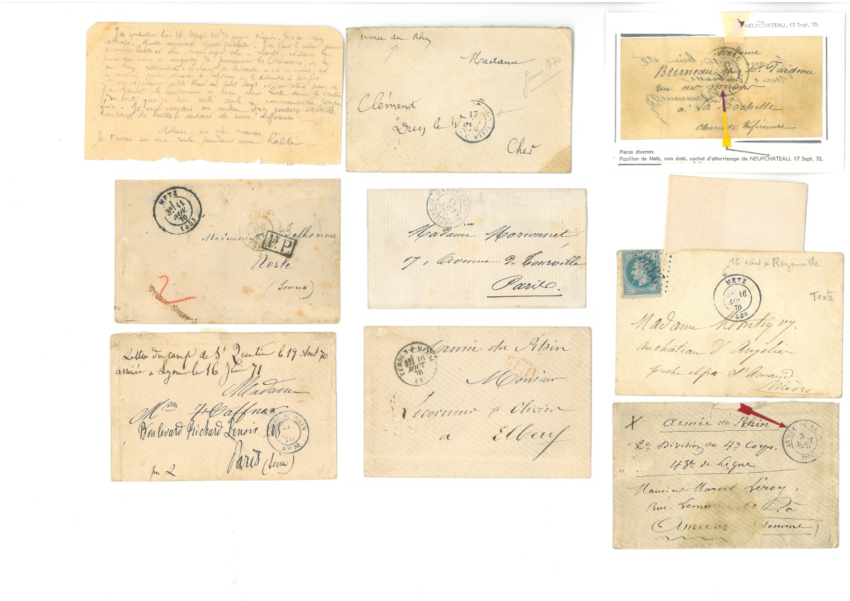". - Enveloppe avec mention manuscrite " Armée du Rhin ", PP rouge càd Verdun-s/Meuse 16 août 1870 en franchise, càd d'arrivée Elbeuf 18 août 1870. - Laissez-passer délivré à Metz le 14 sept. 1870 - Carte de correspondance prussienne écrite et postée lors du siège de Metz le 27 août 1870, cachet " 20. INF. DIV. ". - Enveloppe càd Metz 11 nov. 1870 + PP + Franco Stempel et montant du port payé en numéraire au crayon rouge [Assiégée depuis le 19 août 1870, Metz capitule le 27 oct. Les Allemands ouvrent un bureau de poste dès le 30 oct. Les timbres français n'ayant plus pouvoir d'affranchissement, on réglait en espèce, le postier apposait le cachet Franco Stempel et indiquait au crayon rouge le montant du port payé.] - Papillon de Metz, non daté, cachet d'atterrissage de Neufchâteau, 17 sept. 1870. - Lettre sans texte, càd départ GARDE IMPle QUARTIER Gal 13 août 1870.