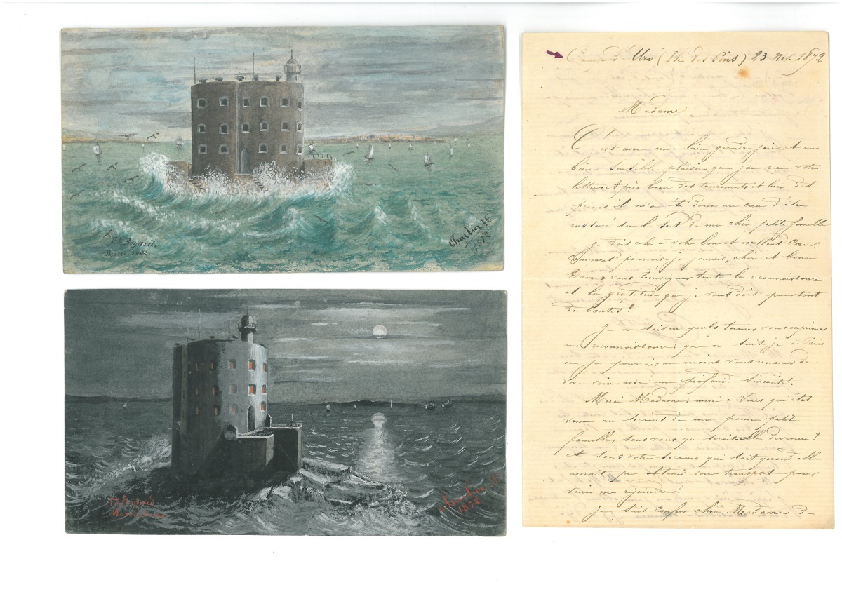 " [il y décède en 1874] ; Joint 2 dessins aquarellés exécutés par Charlier en 1872, représentant le fort Boyard en rade de l'île d'Aix en marée basse et haute ; 3 L.A.S. d'Adèle CHARLIER, son épouse: l'une du 26 juillet 1873, à bord d'un navire en rade en attente pour partir rejoindre son époux en Nouvelle-Calédonie: " (