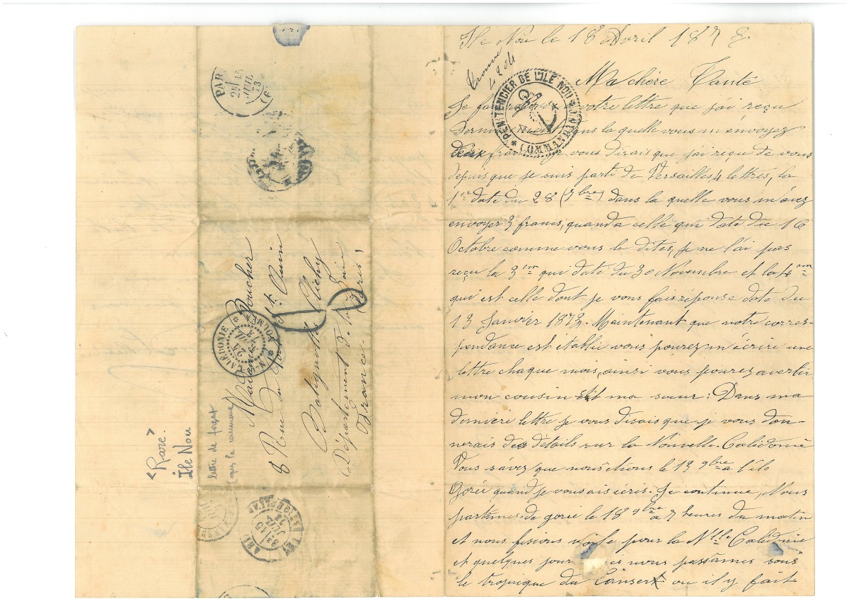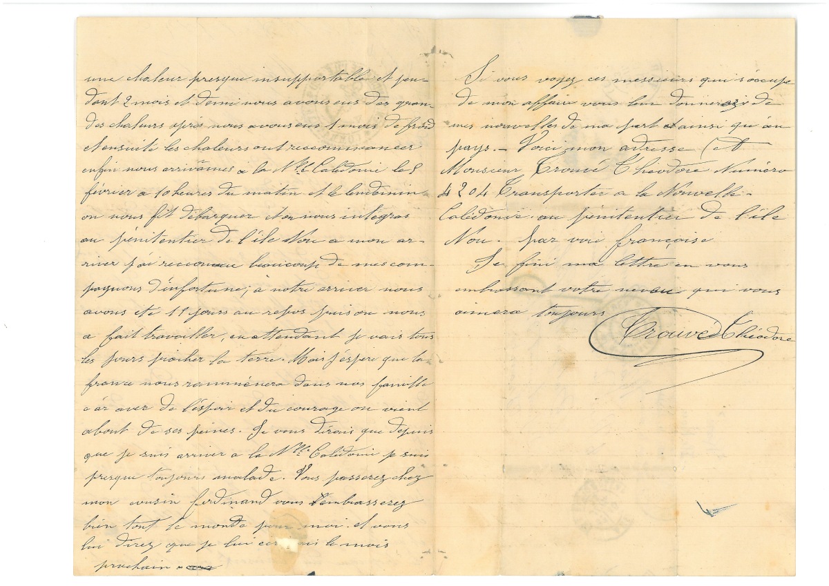 " [Théodore Trouvé, menuisier, 22 ans, condamné aux travaux forcés à perpétuité pour désertion à l'ennemi et usage d'armes, embarqué pour la Nouvelle Calédonie sur le transport à hélice Le Var.] - L.A.S. d'Honoré Amable CHARLIER, camp d'Uro île des Pins [Nouvelle-Calédonie], 23 novembre 1872, détenu sur l'île: " (