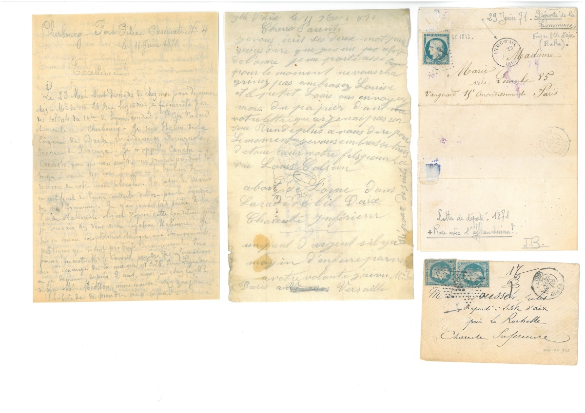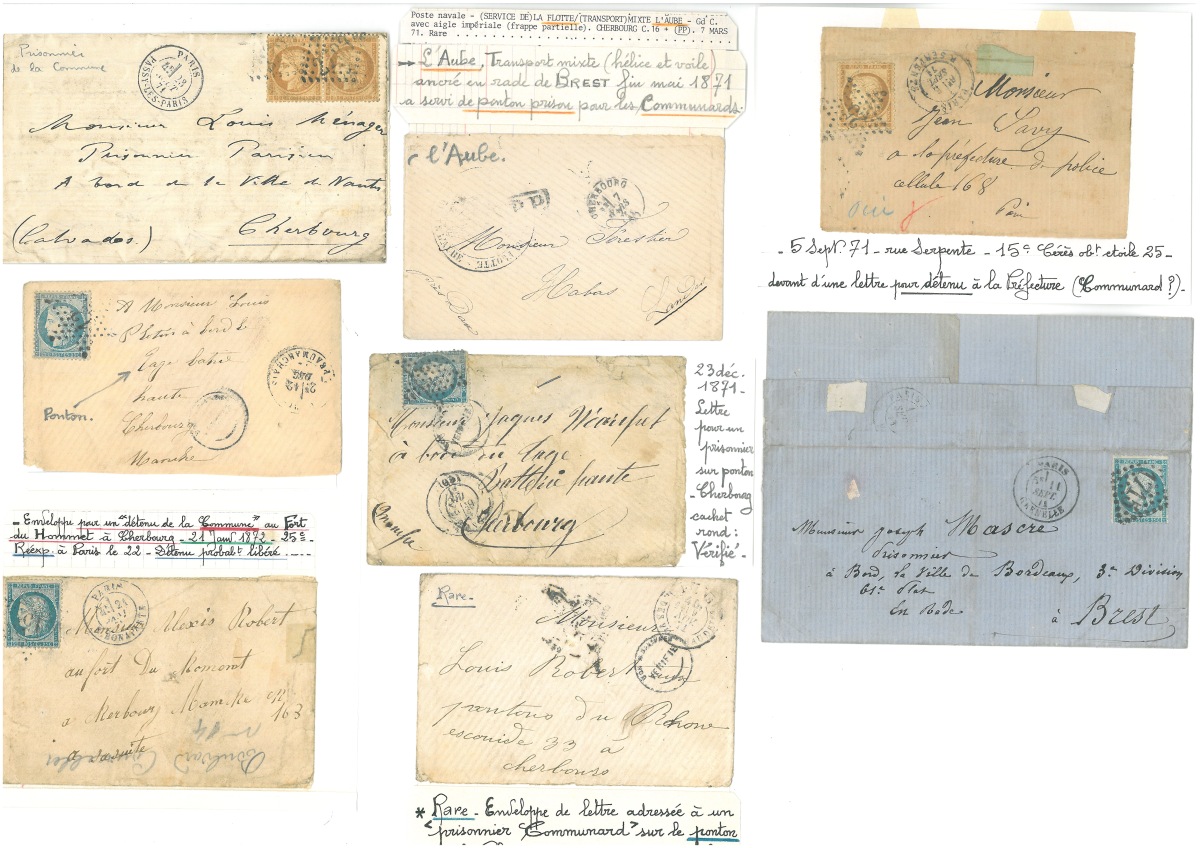 Lot d'env. 60 documents historiques et philatéliques relatifs à l'arrestation et à la déportation de communards, dont L.A.S. de deux Italiens, Conchi Concesto et Courcoude, Cherbourg, Fort Pelée, Casemate n°4, 11 juin 1871, adressée au consul d'Italie à Paris. Belle lettre de deux Italiens faits prisonniers par les " Versaillais " le 23 mai 1871 dans le XVIIe arrondissement puis emprisonnés au Fort Pelée de Cherbourg. Ils y relatent les circonstances de leurs arrestations, arguant de leur innocence. Témoignage vivant des arrestations hâtives et abusives effectuées par la progression des troupes de Thiers durant la semaine sanglante. - Enveloppe obl. Etoile évidée/20c. Empire Lauré x 2 + T 17 Paris adressée à un déporté de la Commune à l'île d'Aix, càd d'arrivée L'ISLE D'AIX 27 juin 71 - L.A.S. d'un déporté, à bord du ponton la Pénélope [Lorient], 11 juin 1871, adressée au général commandant la subdivision à Versailles. - L.A.S. d'un communard déporté, Fort de l'île d'Aix, 27 juin 1871, adressée à sa mère, obl. GC 1833/20c. Cérès, càd L'ISLE D'AIX 29 juin 71: " Ma Mère je t'écris pour te dire que je suis parti de Versailles, je mense de revenir le plus tôt possible