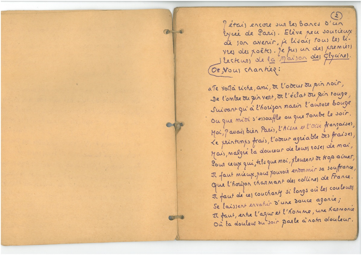 Manuscrit à l'encre violette titrée " Apostrophe à Émile Despax, Dax, 19 septembre 1926 ", 21 pages in-4. Hommage rendu à Émile Despax, poète et écrivain " Mort pour la France ", prononcé lors de l'inauguration d'un monument au nom de l'artiste disparu, érigé en la ville de Dax en 1926. Auteur de La maison des Glycines récompensé en 1905, Emile Despax est tué au combat le 17 janvier 1915, à Moussy-sur-Aisne, d'une balle en pleine tête le jour de son arrivée aux tranchées alors qu'il observait l'ennemi à la jumelle. Son nom est inscrit, sur les plaques commémoratives des écrivains morts au champ d'honneur au Panthéon.