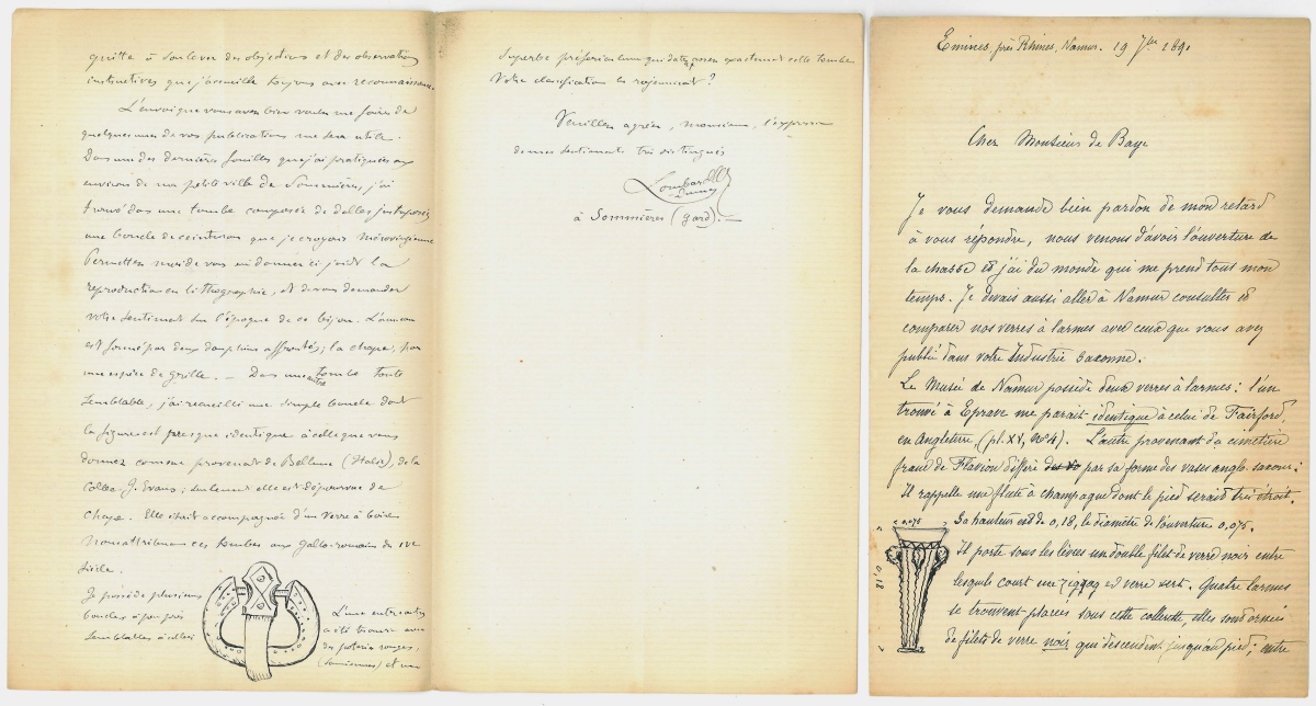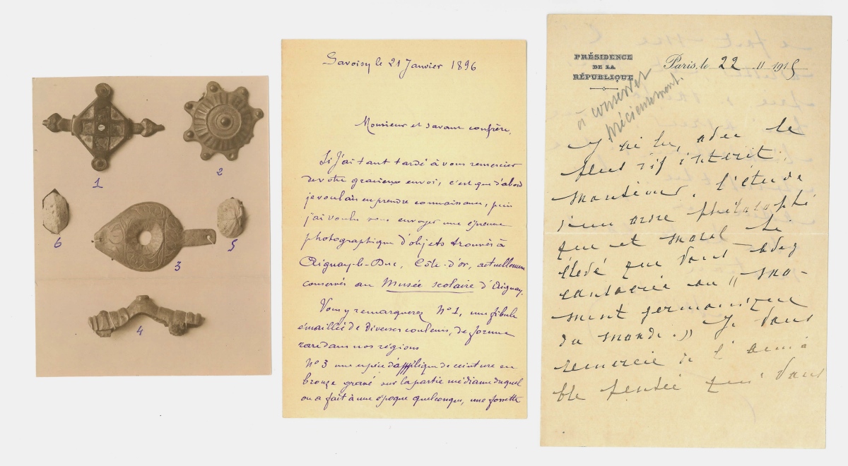 Réunion de + de 250 L.A.S., L.A., L.S. et P.A.S., certaines avec croquis ou photos, adressées à Joseph Berthelot comte puis marquis de BAYE, années 1870-1930. Nombreuses lettres d'archéologues, savants, historiens, conservateurs de musées, hommes politiques, reçues du monde entier (Russie, Allemagne, Angleterre, Roumanie, etc), dont 11 L.A.S. avec 2 croquis Casimir BARRIÈRE FLAVY, archéologue - 2 L.A.S d'Alfred CARAVEN CACHIN, préhistorien - 2 L.A.S avec photo d'Henry COROT, archéologue de l'Institut - 2 L.A.S. Alexis SORLIN d'ORIGNY (écrites de Constantinople), célèbre restaurateur de céramiques - 2 L.A.S de Georges VACHER de LAPOUGE, anthropologue - L.A.S. Eugène LEFEVRE PORTALIS - L.A.S. Alfred REBELLIAU, historien - 2 L.A.S. Edgar MAREUSE, archéologue - + de 60 L.A.S. et L.S. avec photo de l'abbé Pierre Marcel FAVRET, préhistorien, 1925-1930 - L.A.S. Olivier SAINSERE, secrétaire général de la présidence de la République et mécène de Picasso - L.A.S. Maurice BARRÈS - 2 L.A.S. Juliette ADAM, femme de lettres - etc.