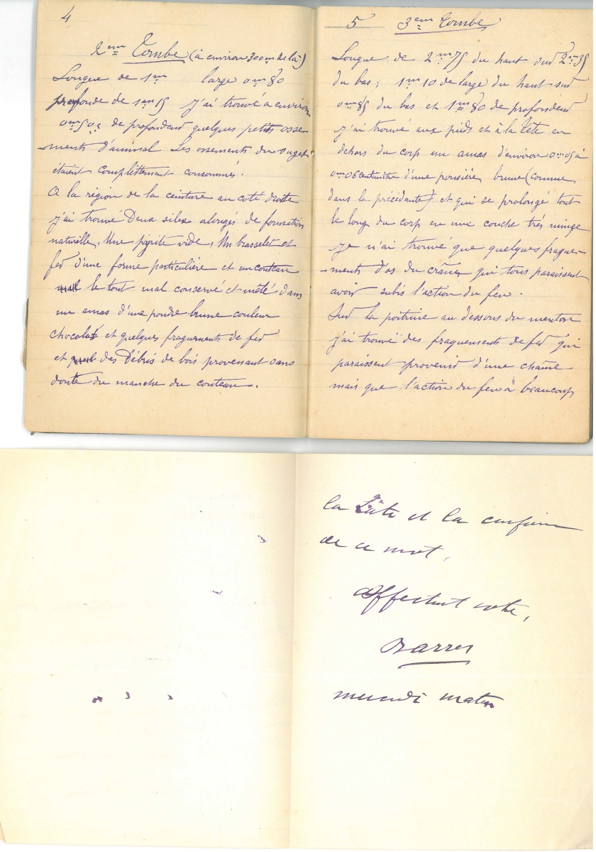 Joint: Carnet manuscrit de notes et relevés des fouilles du cimetière gaulois de Charmont (Marne) contenant la description des " 45 tombes humérus " exhumées - Notes manuscrites de Joseph de Baye relatives à l'histoire de Baye dont manuscrit préparatoire à l'article publié sous le titre " Notes pour servir à l'histoire de l'abbaye du Reclus " - Portrait photographique de Joseph de Baye à la toque de fourrure. Format ovale, réalisé lors d'un séjour en Russie. Au dos, écriture manuscrite: "Joseph / Poltave190(2?)" et tampon en cyrillique. Début du XXe. 15 x 10,5 cm. Dans un cadre de forme rectangulaire en laiton doré et imitation de corne verte à décor d'un ruban noué, branches de laurier, frise de joncs rubanés et rinceaux. Style Louis XVI, début du XXe. 19,5 x 14 cm - Lot de plaquettes et brochures éditées, certaines avec envoi au comte de Baye.