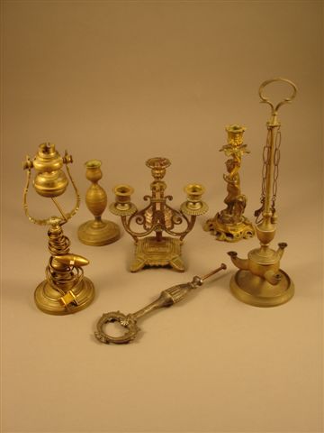 ENSEMBLE DE BRONZES divers: trois flambeaux, un chandelier à deux bras de lumières, une lampe à huile. On y joint une lampe en bronze et une tige d'huilier-vinaigrier en métal patiné. XIXème siècle.