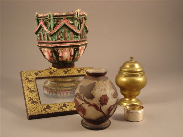 Lot de BIBELOTS: un pied de lampe ajouré, une boite à thé, un couvercle de boite à pommade, un cadre en cuir à décor de lions, un petit vase ovoïde en verre soufflé gravé à l'acide et portant une signature "RICHARD". (accidents).