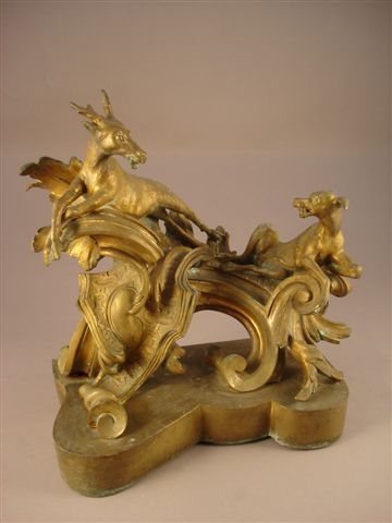 CHENET en bronze ciselé et doré à décor de scène cynégétique représentant la lutte d'un chien et d'un chevreuil. Répertoire iconographique du XVIIIème siècle: rinceaux feuillagés, coquille, frise d'oves et enroulements de volutes. Repose sur un socle. Style Louis XV. Milieu XIXème siècle. Haut. 37, Larg. 31, Prof. 18 cm.
