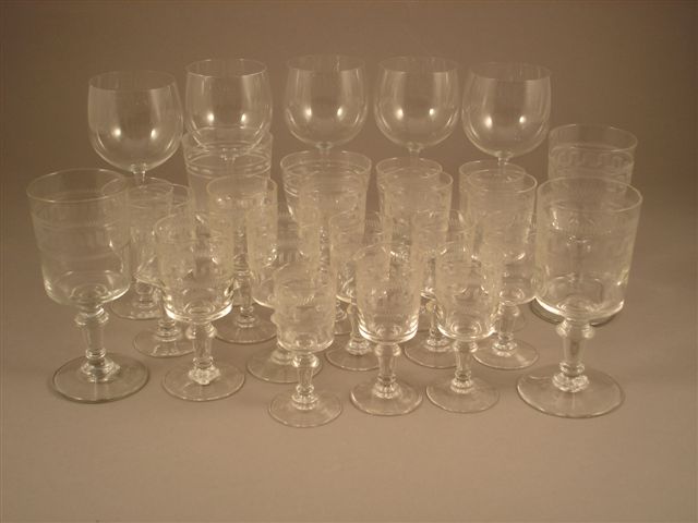 PARTIE DE SERVICE de 16 VERRES en verre à décor de frise géométrique. Il comprend trois verres à eau, sept verres à vin blanc, six verres à liquoreux.