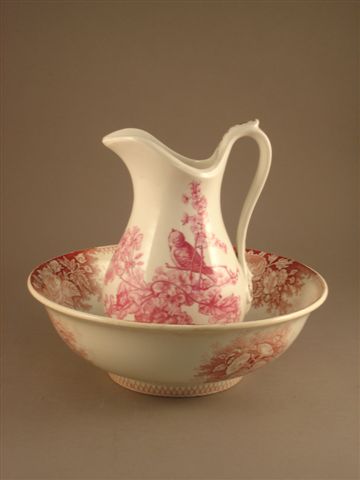 Réunion de TROIS BROCS DE TOILETTE en faïence polychrome. On y joint deux vasques, deux plateaux et une coupelle pour meuble de toilette.
