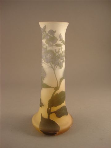 Émile GALLÉ (1846-1904). VASE tubulaire. Décor tournant de bleuets, dégagé à l'acide dans la couche superficielle blanc-rosé sur fond opalin. Signé.