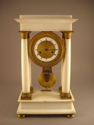 PENDULE PORTIQUE en marbre blanc et bronze doré. L'entablement est soutenu par quatre colonnes et supporte le cadran cylindrique à chiffres romains. Signé "THOMAS à Paris".