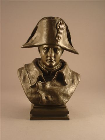 ÉCOLE FRANÇAISE. Buste de Napoléon Premier en redingote et chapeau à cocarde. Bronze à patine brune.
