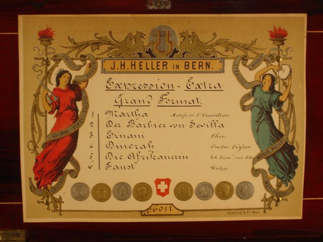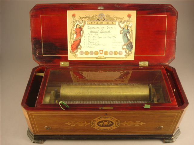 BOITE À MUSIQUE 6 airs. Coffret en bois de placage de forme rectangulaire à pans coupés. La façade et le couvercle centrés de cartouches octogonaux fleuris. Porte une étiquette: J.H. HELLER à Bern. Remontage à levier, cylindre 33,5 cm. Carte d'airs. Fin XIXème siècle.