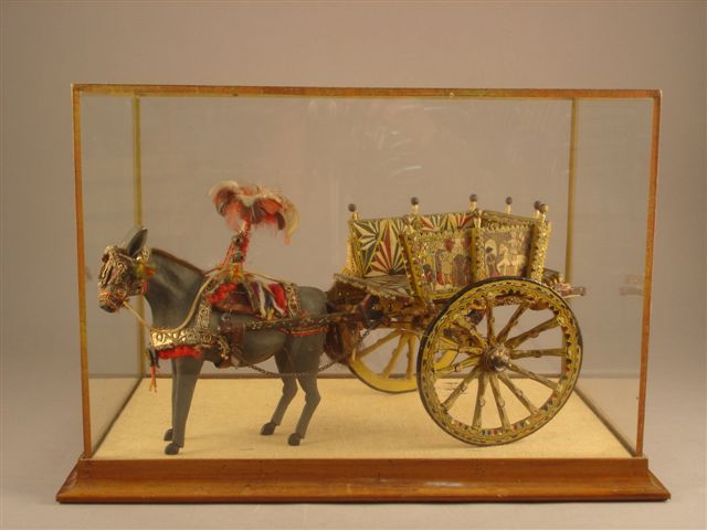 RÉDUCTION d'une charrette tractée par un cheval. Figurine en bois, fil, plume et tissu.