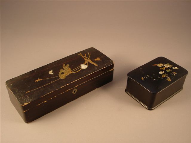 ENSEMBLE DE DEUX COFFRETS rectangulaires en bois noirci à décor de fleurs et d'insectes.