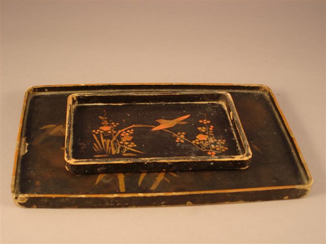 DEUX PLATEAUX rectangulaires en bois noirci à décor japonisant d'oiseaux et roseaux.