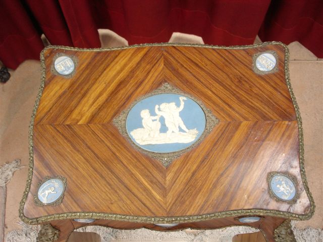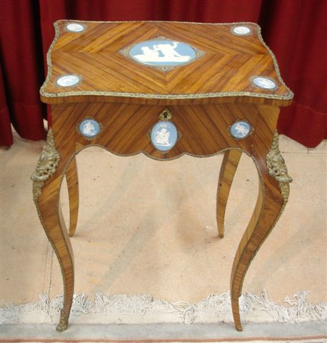 TABLE À OUVRAGE en placage de bois de rose marqueté en feuilles. Elle est ornée de douze médaillons en ceinture et de cinq médaillons sur le plateau à l'imitation de la porcelaine de Wedgwood sur le thème des Amours musiciens. Riche répertoire antiquisant dans le goût du XVIIIème siècle. Le médaillon central décoré de trois Amours dansant au son d'un violon. Les scènes figurant dans les écoinçons décrivent l'alliance de la Musique et des Dieux autour du feu sacré et d'une bacchanale. Un tiroir à la ceinture. Pieds cambrés. Ornementation de bronzes ciselés et dorés à décor de rocailles, encadrements de feuillages, frises d'oves et fleurs stylisées.