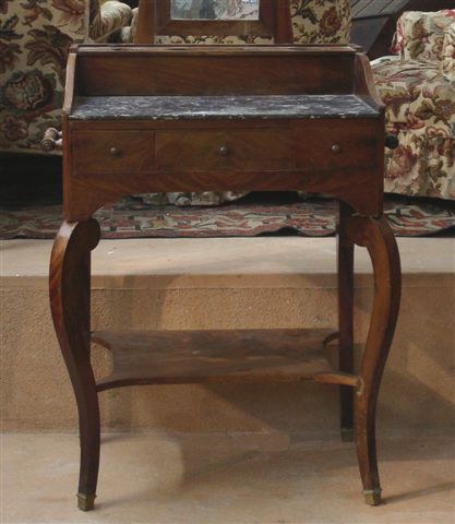 TABLE COIFFEUSE en acajou et placage d'acajou mouluré. Elle ouvre à trois tiroirs en ceinture. La partie supérieure est surmontée d'une glace basculante. Pieds cambrés réunis par une tablette d'entretoise. Meuble garni de marbre gris veiné de blanc.