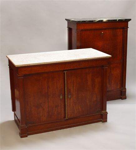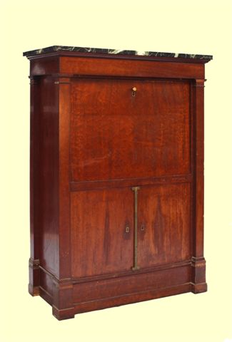 1 - SECRÉTAIRE À ABATTANT en acajou et placage d'acajou. Partie supérieure ouvrant à un tiroir et un abattant à contrepoids découvrant six tiroirs (un manquant) et trois casiers. Partie inférieure ouvrant à deux vantaux masquant une étagère et un tiroir. Les quatre montants sont à méplats. Dessus de marbre vert.