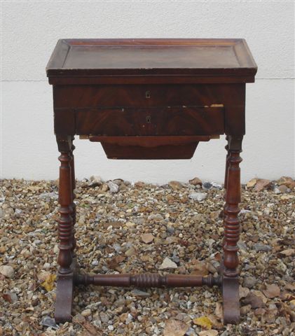 TABLE À OUVRAGE de forme rectangulaire en placage d'acajou. Elle ouvre à un abattant dévoilant trois casiers, un tiroir en ceinture et un tiroir dissimulé dans la partie inférieure. Les montants en doubles colonnettes réunis par une entretoise et terminés par deux patins.