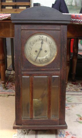 CARILLON. Le coffre en bois naturel de forme rectangulaire sommé d'un fronton hémisphérique. Cadran à chiffres arabes. Partie inférieure vitrée.