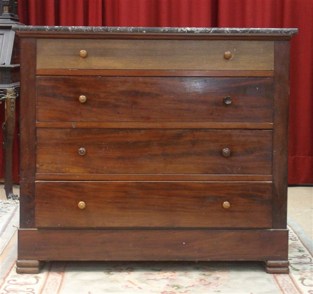 Petite COMMODE de forme rectangulaire en placage d'acajou. Elle ouvre à quatre tiroirs sur quatre rangs séparés par des traverses. Montants à pans vifs. Dessus de marbre gris Saint-Anne.