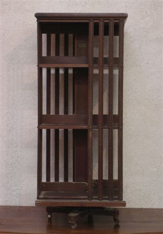 BIBLIOTHÈQUE TOURNANTE en bois exotique. Elle comporte deux étagères, trois niveaux et repose sur un piètement terminé par quatre roulettes. Porte une inscription: "BIBLIOTHÈQUES TOURNANTES. EM. TERQUEM. PARIS. SYSTÈME BREVETÉ SGDG".