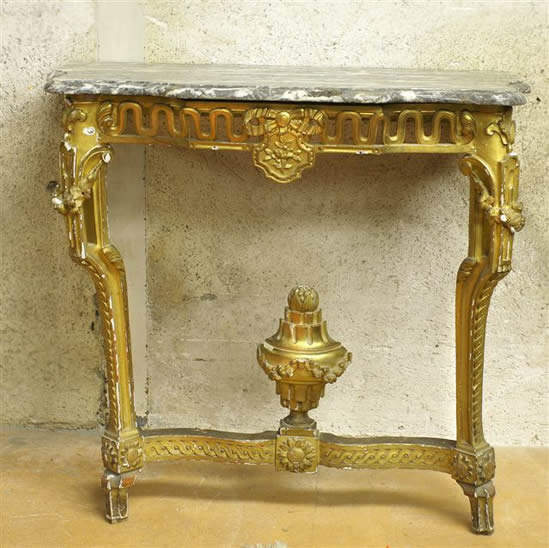 CONSOLE d'APPLIQUE en bois doré et sculpté. Les côtés cintrés. Riche décor ajouré en ceinture d'une frise d'entrelacs centrée d'un cartouche fleuri. Elle repose sur deux pieds ornés, dans la partie supérieure, d'une guirlande de fleurs et, dans la partie inférieure, d'un chapelet de piastres. Entrejambe surmontée d'une urne fleurie. Louis XVI. XVIIIème siècle. Dessus de marbre gris et blanc à décrochements.