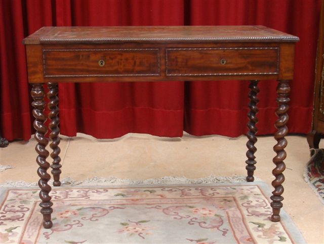 TABLE-BUREAU en noyer mouluré et sculpté. Elle ouvre par deux tiroirs en ceinture. Piètement en spirale. Le plateau orné d'une frise de godrons.