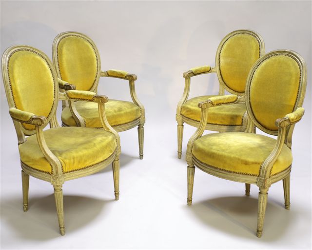 Suite de 4 FAUTEUILS cabriolet en bois relaqué gris. Dossier médaillon. Décor sculpté de rosaces et cannelures. Ceinture légèrement bombée. Pieds antérieurs fuselés à cannelures rudentées.