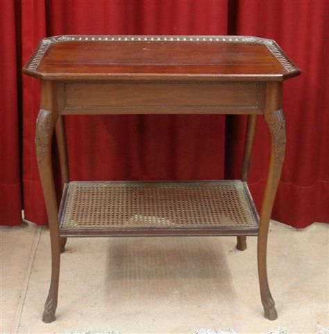 TABLE DE SALON en bois naturel. Plateau octogonal sculpté de feuilles stylisées. Piètement galbé terminé en pieds de biche. Tablette d'entretoise cannée.
