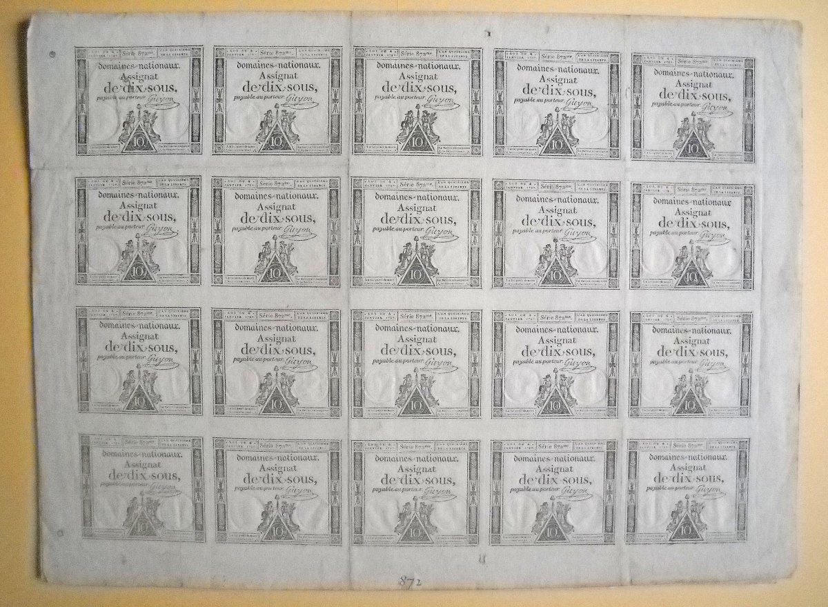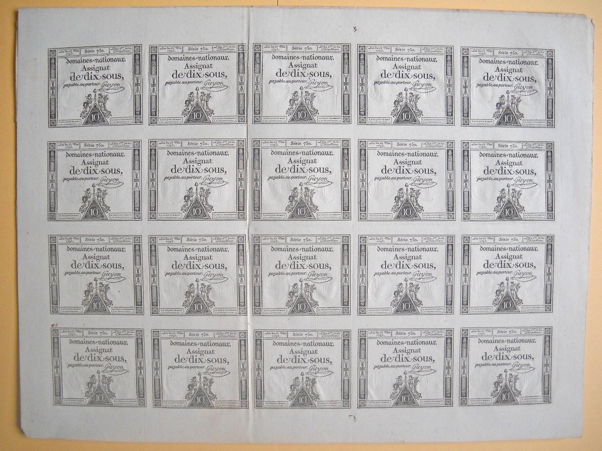 [Révolution française] Assignat de 10 sous. Lot de 87 exemplaires.3 feuilles complètes de 20 ex. du 4 janvier 1792 - 5 ex. du 24 octobre 1792 - Feuille complète de 20 ex. et 2 ex. découpés du 23 mai 1793. État moyen à T.B.E.