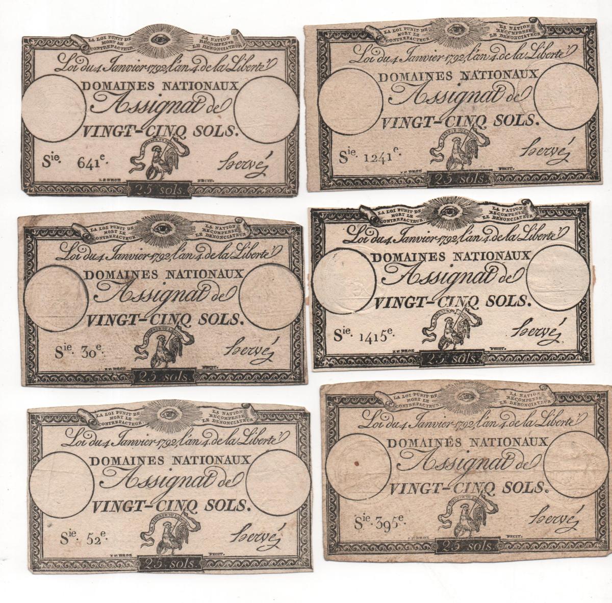 6 ex. de vingt-cinq sols, découpés, en l'état.