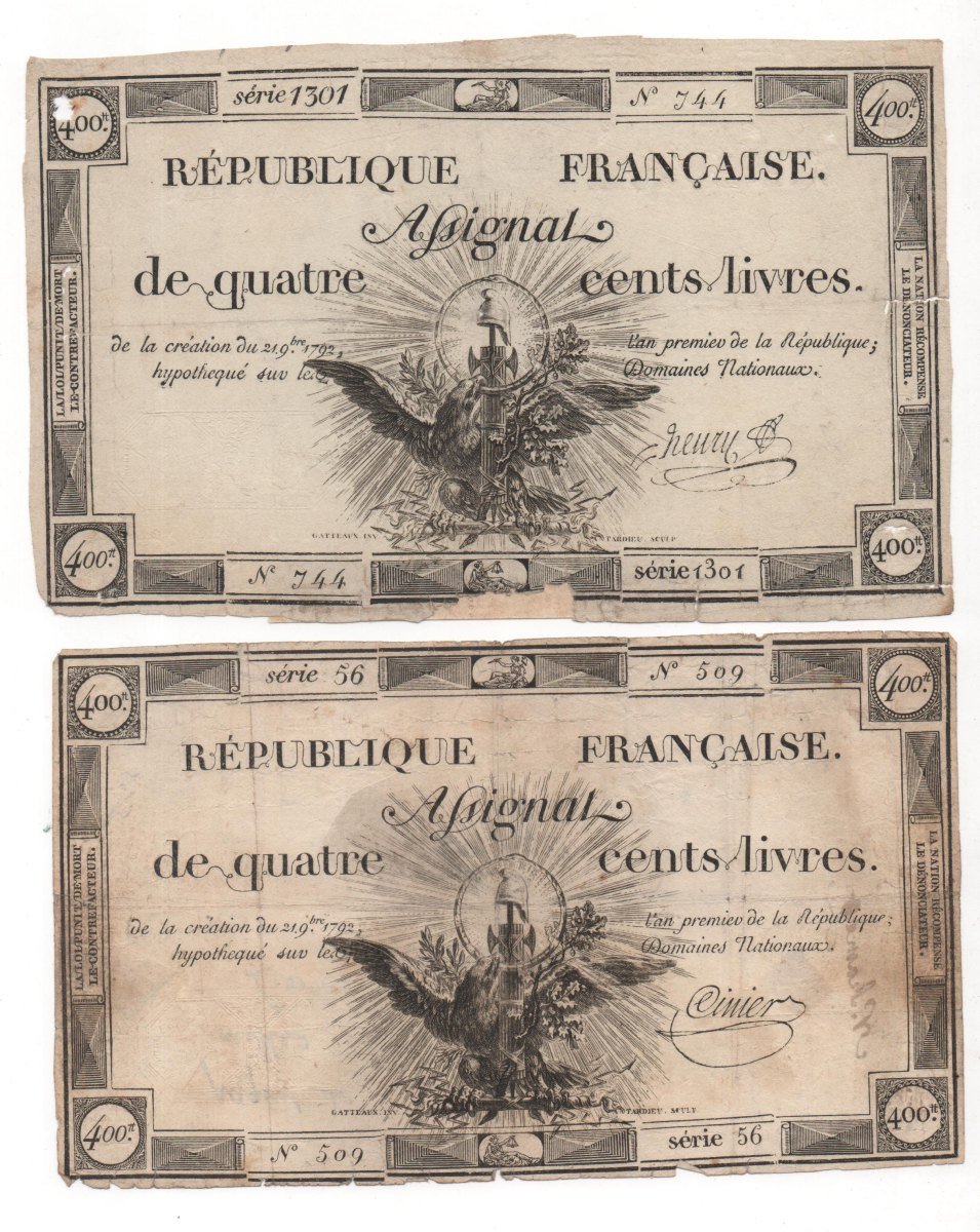 [Révolution française] Assignat de 400 livres, création du 21 novembre 1792, l'an Ier de la République.