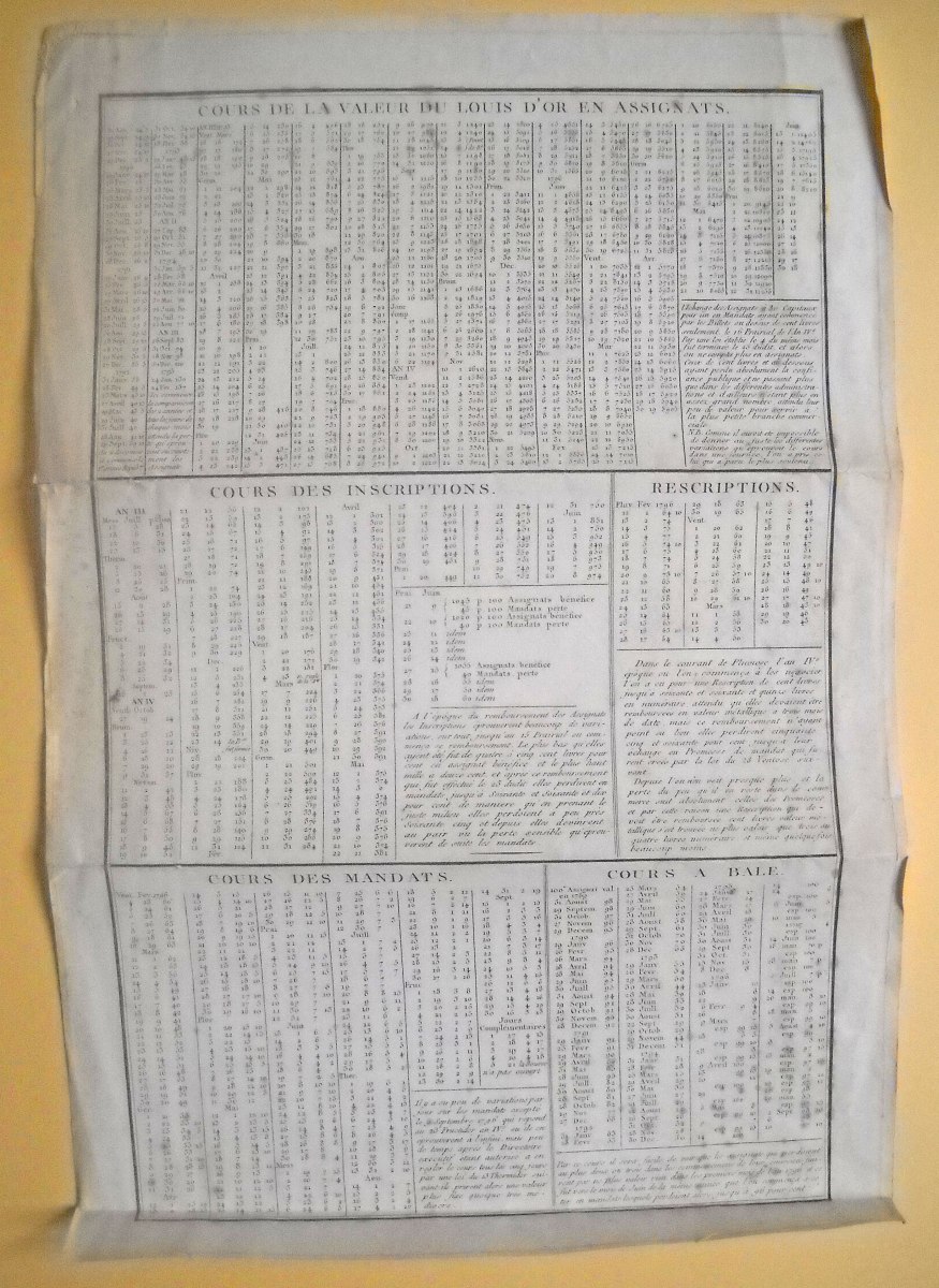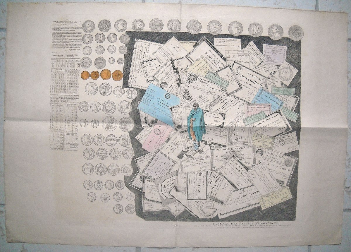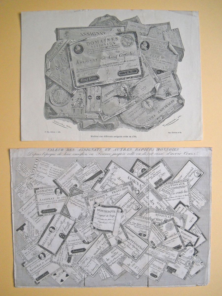 " Tableau des papiers et monnoyes [en trompe l'il] avec l'échelle de proportion de leur valeur pendant leurs cours adopté par le conseil des Anciens le 5 Messidor An.V. Dessine? et Ecrit a? la Plume d'apre?s les Originaux par A. A Lejeune et Re?duit par Tassart. " [1797], gravure à rehauts de coloris d'époque, 62,5 x 90 cm, petite déchirure ; " Valeur des assignats et autres papiers monnoies depuis l'époque de leur emission jusqu'à celle ou ils ont cessé d'avoir cours ", [1797-1805] gravé par Charles Pierre Normand, 19 x 27 cm, traces de plis et petits défauts ; " Modèles des différents assignats créés en 1791 " dessiné par Gerlier, Imp. Charaire & fils, 17,5 x 23,5 cm ; " Cours de la valeur du louis d'or en assignats / Cours des inscriptions / Rescriptions / Cours des mandats / Cours à Bale ", [1796], 44 x 29 cm.