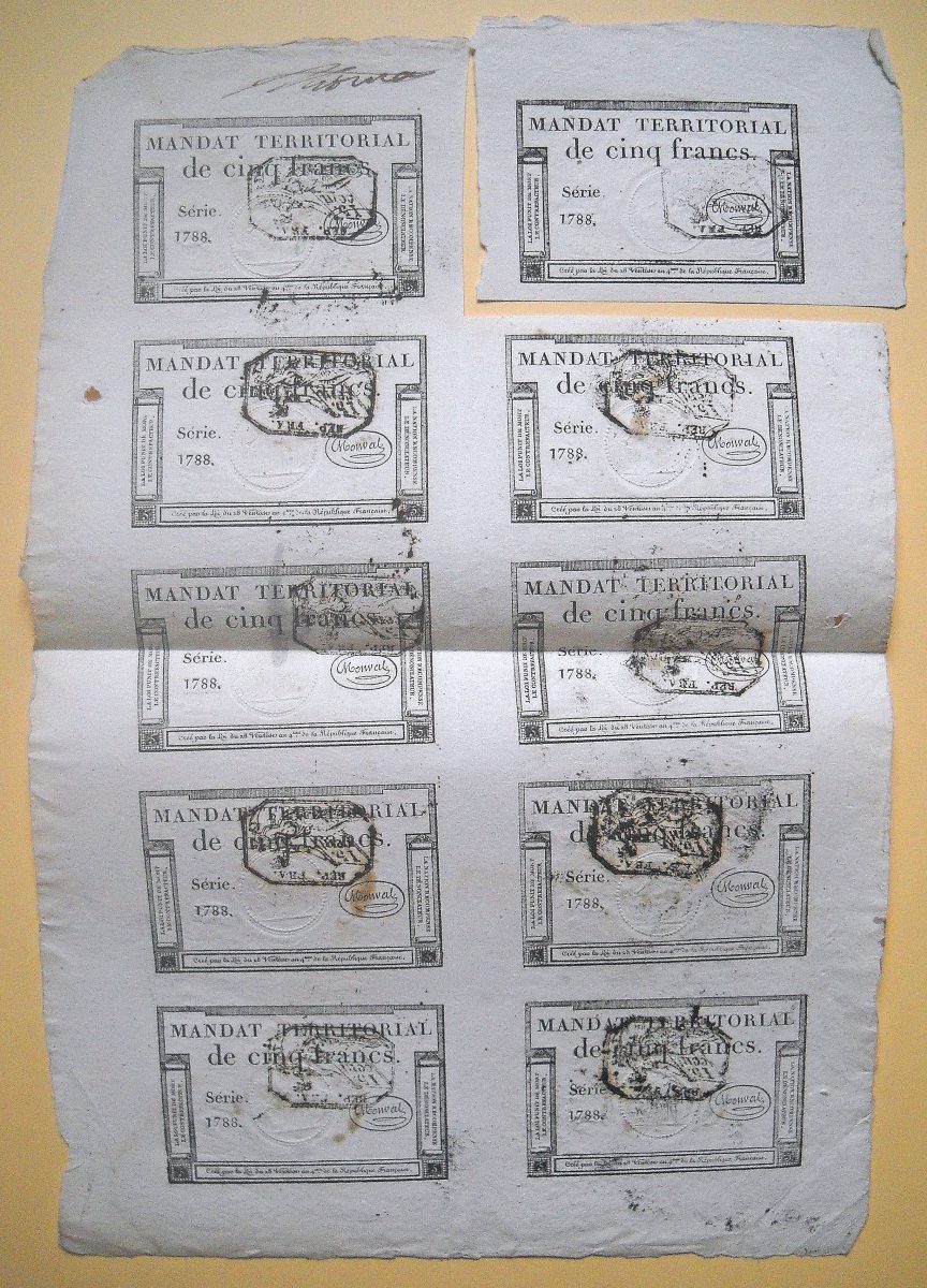 [Révolution française] Mandat territorial de 5 francs. 10 exemplaires [1798].