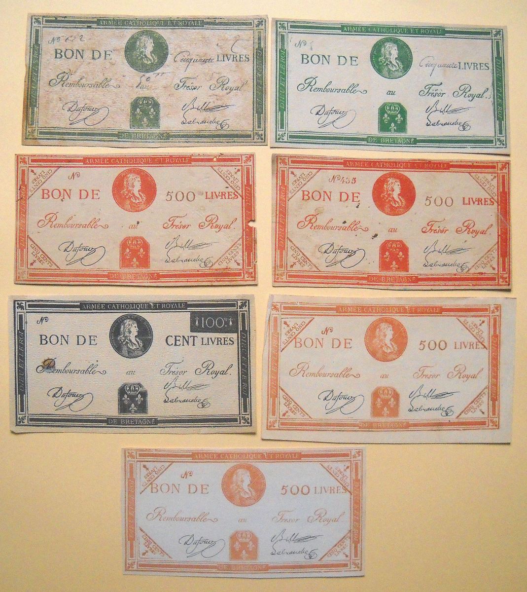 2 ex. de cinquante livres - 1 ex. de cent livres - 4 ex. de 500 livres.