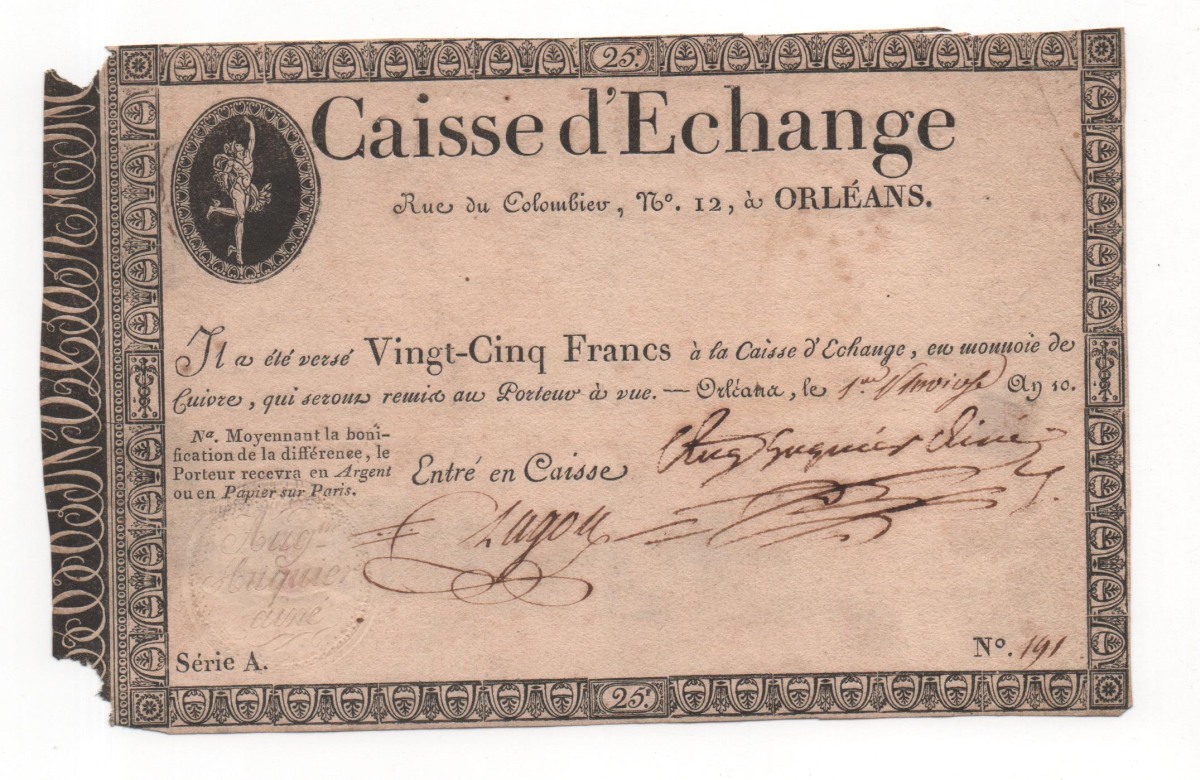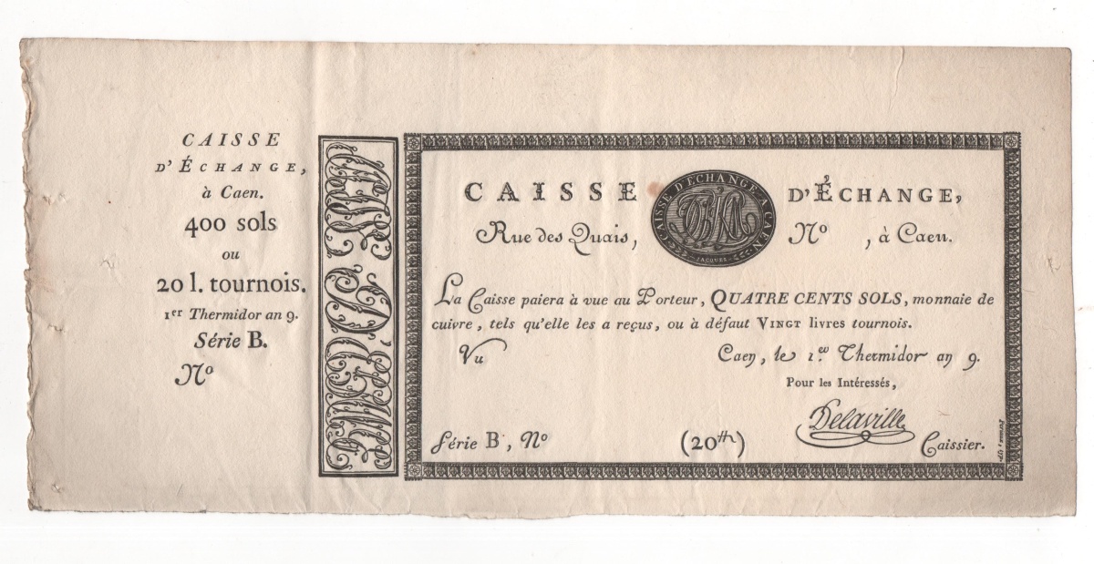 1 ex. de quatre cents sols de la caisse d'échange de Caen, non émis avec souche, an IX ; 1 ex. de vingt-cinq francs de la caisse d'échange d'Orléans, an X