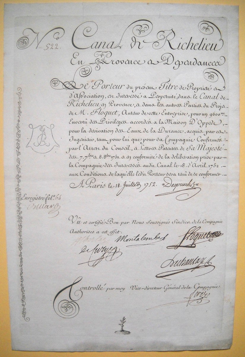 [Louis XV - Actions] Canal de Richelieu en Provence et dépendances. 2 pièces, 1752 et 1753.