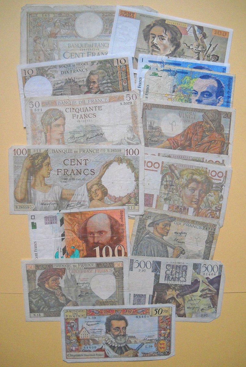 20 francs le pêcheur (1948) ; 2 ex. 50 F. Saint Exupéry (1993 et 1997) ; 10 F. Voltaire (1971) ; 100 F. Delacroix (1985) ; 2 ex. 100 Francs Luc Olivier Merson (1936 et 1938) ; 50 F. Cérès (1936) ; 3 ex. 100 F Jeune paysanne France (1946, 1948 et 1949) ; 100 F. Sully (1941) ; 10 F. Mineur (1949) ; 100 F. Cézanne (1997) ; 50 nouveaux francs Henri IV (1961) ; 50 F. Jacques Cur (1940) ; 500 F. Châteaubriand (1947). États divers.