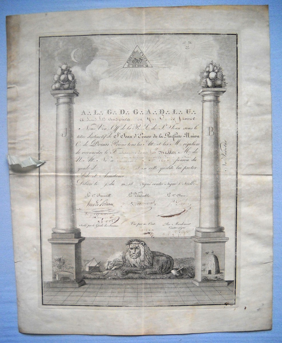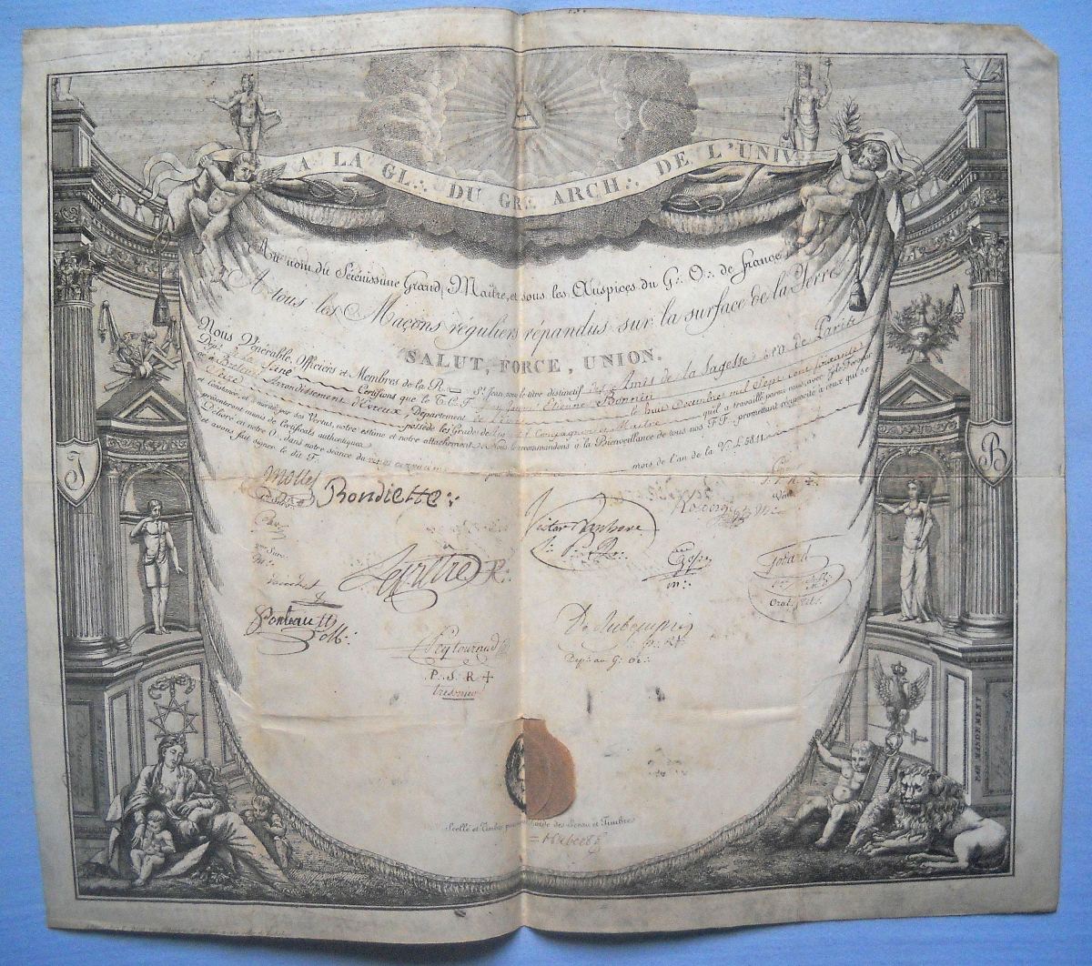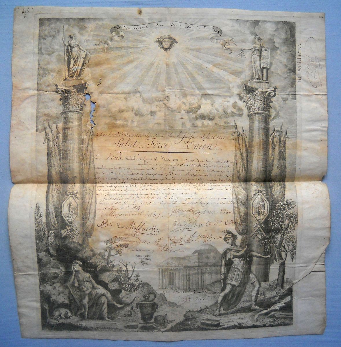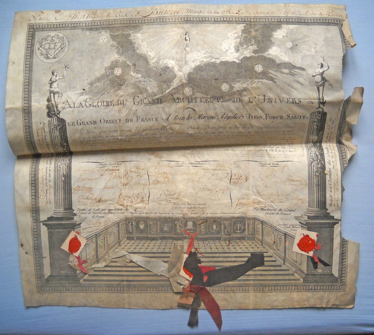 4 diplômes sur parchemin décernés par la: loge des " Amis de la Paix " à Paris en 1802 avec cachets de cire rouge et rubans (en l'état) ; loge de " Saint Jean d'Ecosse de la Parfaite-Union " à Douai en 1807 ; loge des " Amis de la Sagesse " à Paris en 1811 ; l'ordre de Saint Jean à Auch en 1813.