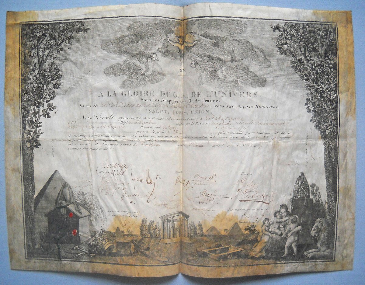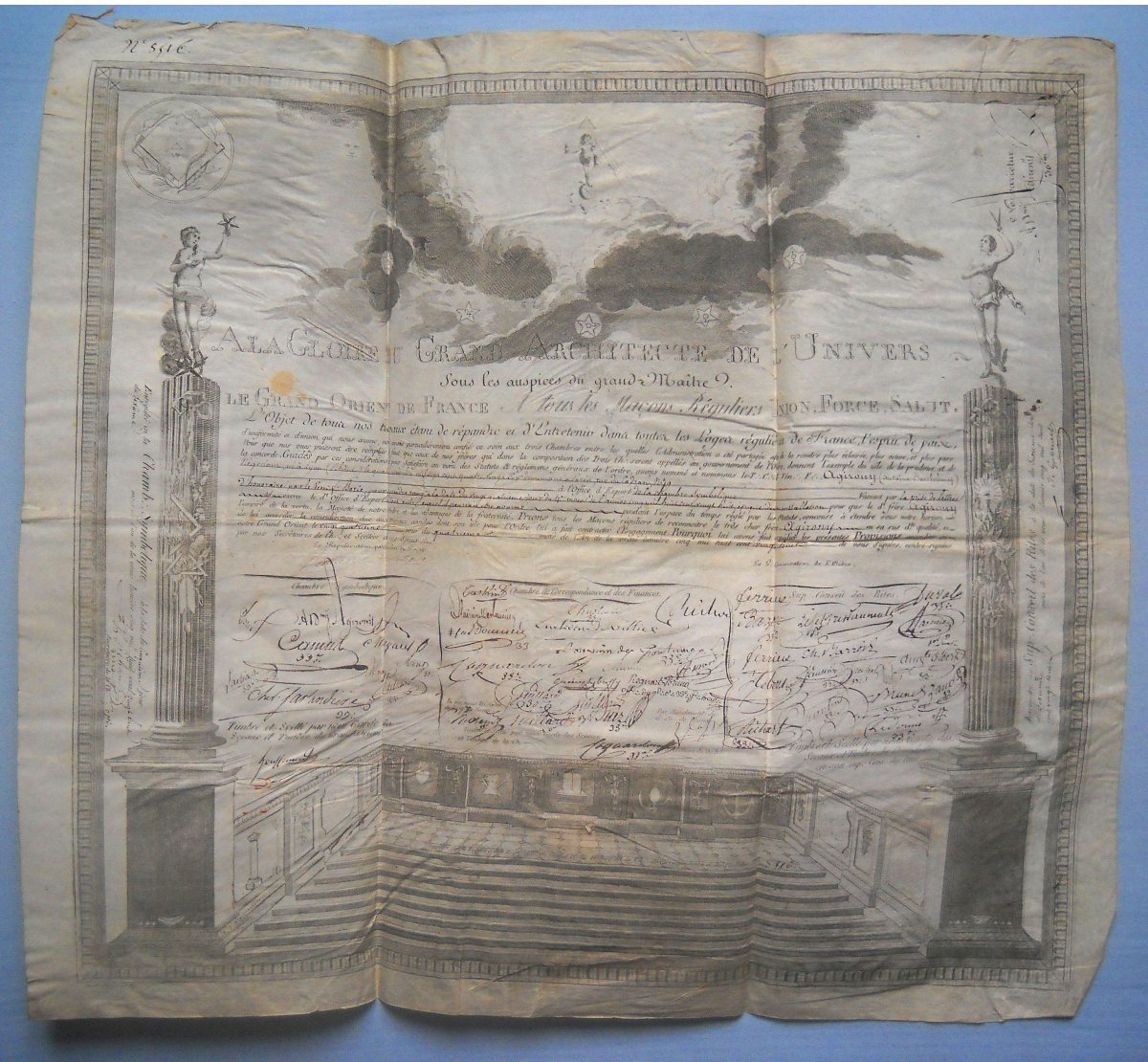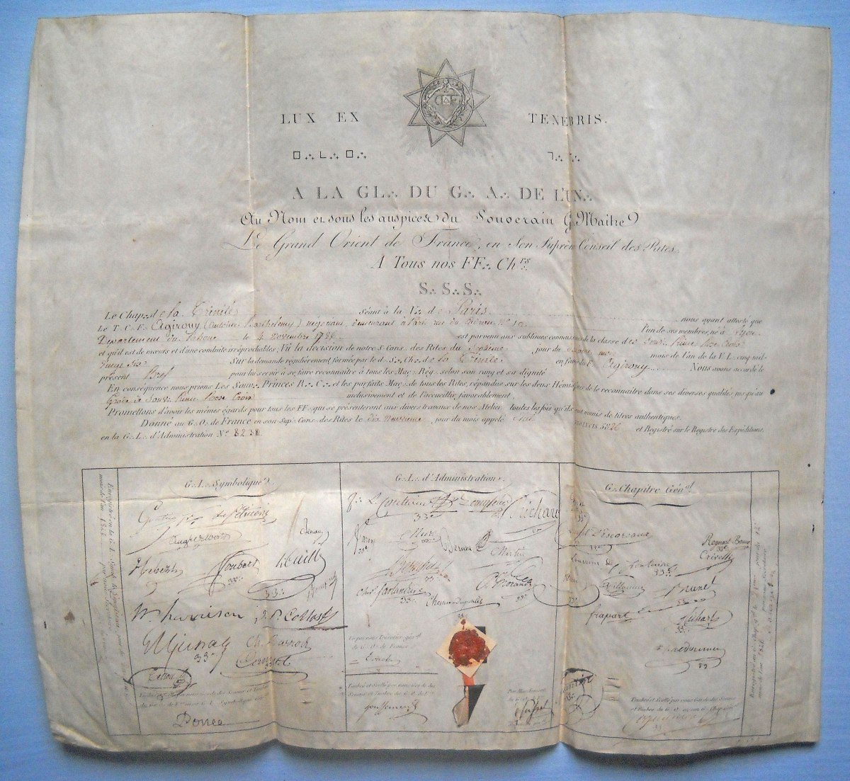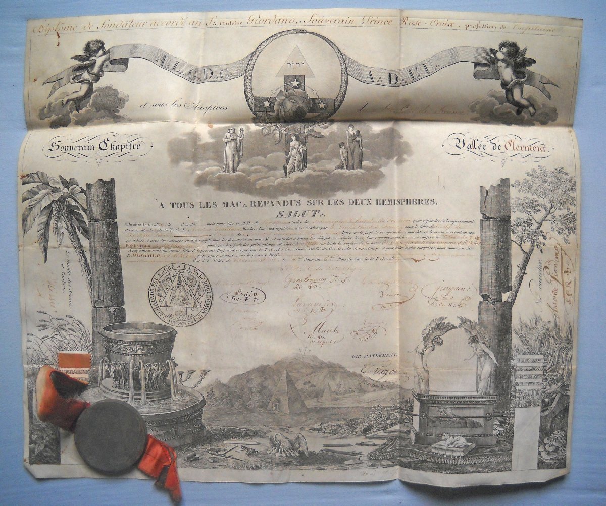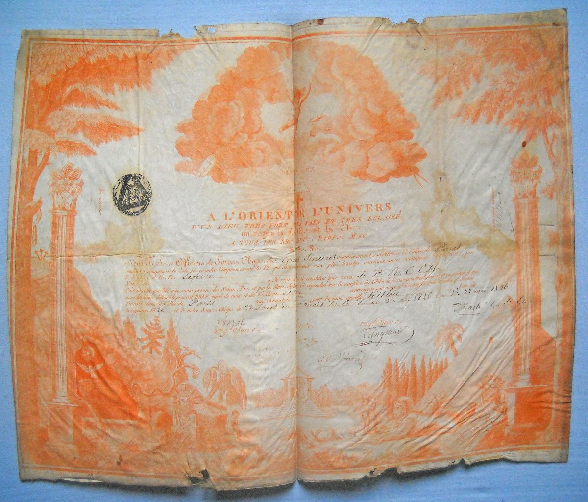 6 diplômes sur parchemin décernés par la: loge des " Cœurs Sincères " à Paris en 1826 ; loge de " La Trinité " à Paris en 1826 au grade de souverain Rose-Croix ; loge de " La Fidèle maçonne " à Cherbourg en 1827 ; l'ordre du Grand Orient de France à l'office d'expert de la chambre symbolique à Paris en 1828 ; loge du " Feu Sacré " à Clermont-Ferrand en 1829, avec partie de boite en métal et cachet de cire rouge ; loge de " l'Union Parfaite de la Persévérance " à Paris en 1829, avec partie de boîte de métal et cachet de cire rouge (manque).