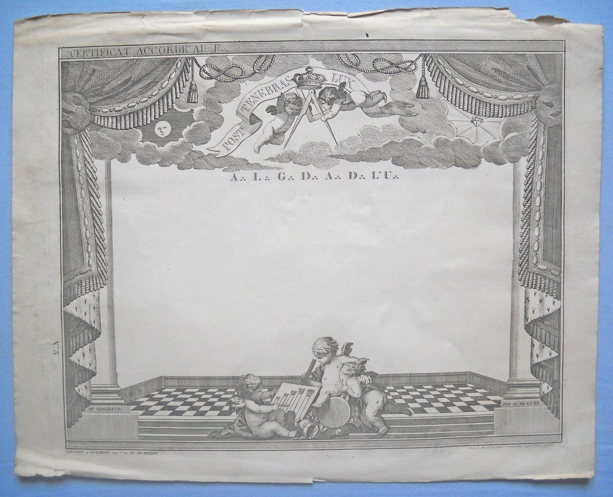 Joint: diplôme sur parchemin décerné par la loge de la " Sincère Amitié " à Rouen, non daté - Diplôme vierge sur papier de la loge maçonnique de " Saint Amable " de Riom - Diplôme de compagnon du tour de France délivré à Tours en 1854 - Diplôme de compagnon du tour de France charpentier délivré à Saumur en 1841 - 3 diplômes vierges sur parchemin - 5 diplômes vierges sur papier.