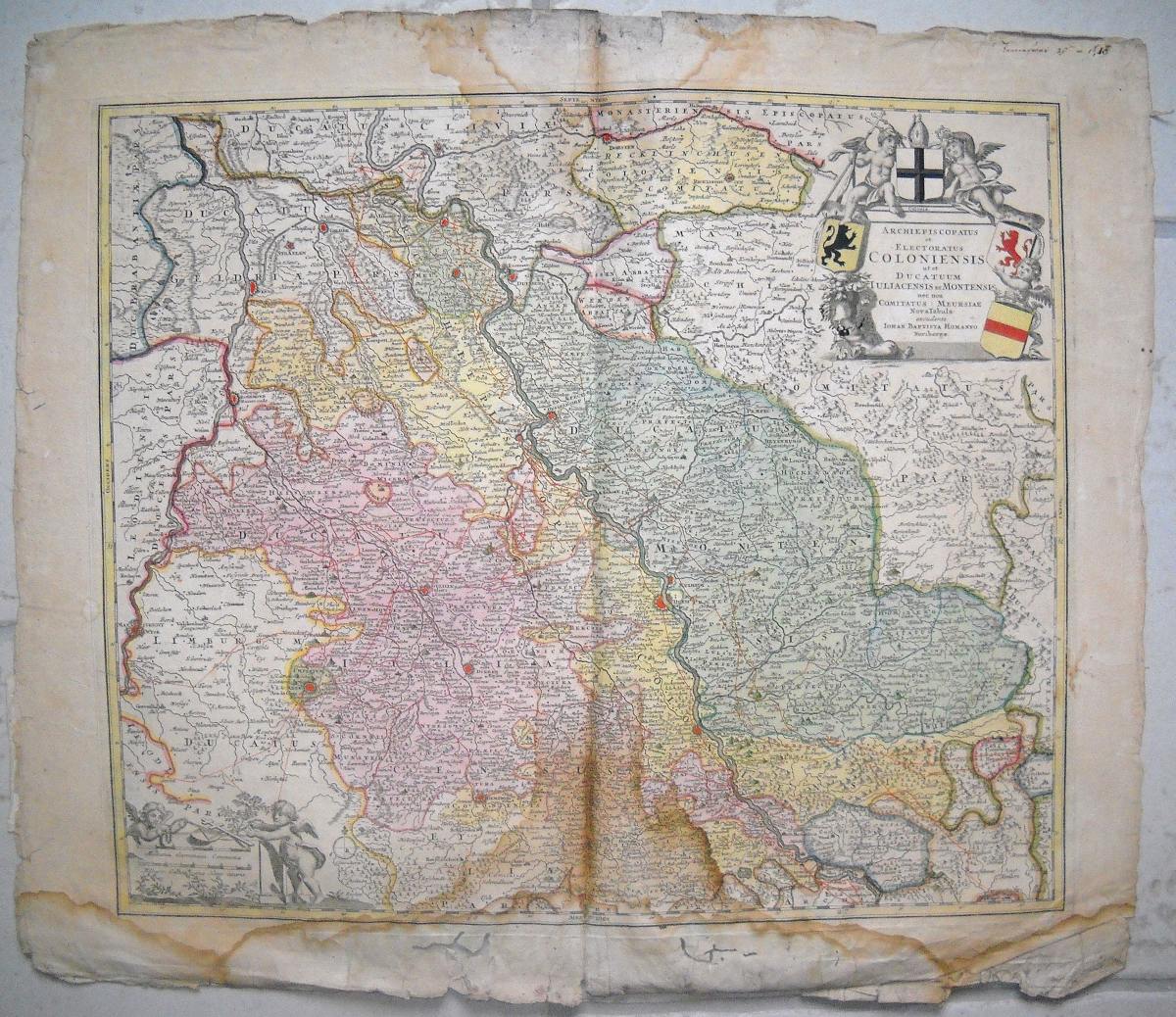 " Principatus Brandenburgico Culmbacensis vel Baruthinus tabula geographica quoad partem superiorem expressa " [Principautés de Bayreuth et Kulmbach, sans date], titre en latin dans un cartouche, légendes en allemand, ill. et armoiries en coloris d'époque. 56 x 67 cm. Pli vertical, mouillures en marges, petits défauts - " Archiepiscopatus et electoratus Coloniensis ut et ducatum Iuliacensis et Montensis nec non comitatus Meursiae nova tabula / excudente Iohan. Baptista Homanno " [archevêché et électorat de Cologne, 1724], cartouche, ill. et armoiries en coloris d'époque. 58 x 67 cm. Pli vertical, mouillures, défauts en marges - Tabula geographica exhibens regnum Sclavoniae cum Syrmii ducatu ex mappa grandiori desumta / Carte du royaume d'Esclavonie et du duché de Syrmie, dont l'un et l'autre est arrosé par le Danube, l'Illove, la Save et la Drave, in lucem edita ab Homannianis heredibus ", [royaume de Slavonie et duché de Syrmie], 1745, cartouche et ill. en coloris d'époque. 57 x 65 cm. Pli vertical, mouillures, défauts et restauration.