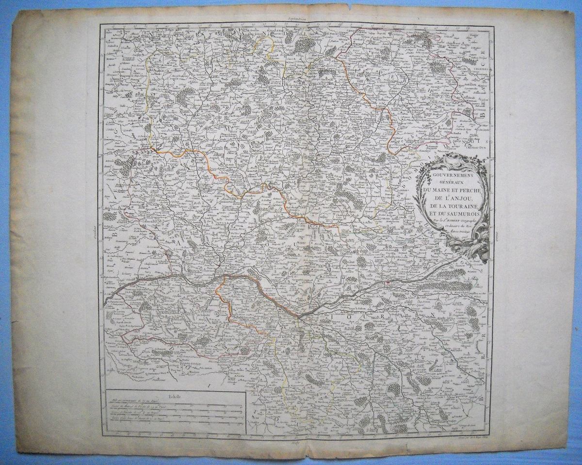 " Loudunois / Mirebalais " [XVIIe s.]. Coloris d'époque. 44 x 57 cm. Pli vertical. Montée sur carton fort (46 x 65 cm) - " L'évêché d'Angers, divisé en archidiaconnez et subdiv. en doyennez et en archiprestrez / Le duché et gouvernement d'Anjou divisé en pays, etc. Dressé sur les mémoires de Jean Le Loyer, géographe et dédié à monseigneur le duc d'Anjou, par son très humble et très obéissant serviteur de fer géographe de Monseigneur le Dauphin. " [1697]. 37 x 46 cm. Coloris d'époque. Pli vertical. Monté sur carton fort (65 x 49 cm). - " Carte particulière d'Anjou et de Touraine ou de la partie méridionale de la généralité de Tours / par Guillaume de L'Isle... " [1720-1740]. Coloris d'époque. 56 x 76 cm. Plis verticaux. Bel exemplaire. - " Gouvernements généraux du Maine et Perche, de l'Anjou, de la Touraine et du Saumurois, par le Sr ROBERT (DE VAUGONDY), géographe Ordinaire du Roi, 1753 ", gravée par DE LA HAYE L'AÎNE. Cartouche de titre à droite. 51,5 x 65,5 cm. Pli vertical, petits défauts en marge.