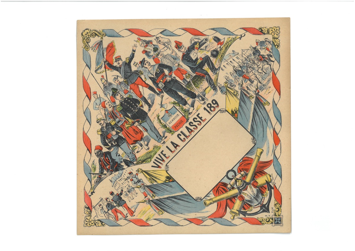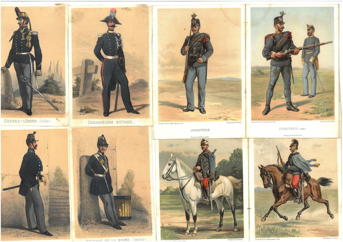 Dont certificat de services délivré à un chef d'escadron du 22e régiment d'infanterie de ligne, Bologne 1811- Certificat de bonne conduite du XXe régiment de chasseurs, 1897 - Lot de + de 65 pièces: programmes de manifestations et de fêtes militaires, invitations, menus, etc - Plaquette in-fol. intitulée " Collection des programmes du théâtre militaire du 62e de ligne illustrés par Gabriel Gostiaux, Dijon, 1864-1865 " - Carnet ayant appartenu au capitaine d'habillement du 3e régiment de cuirassiers intitulé " Uniformes de l'armée allemande " contenant descriptions et dessins imprimés à rehauts d'aquarelles, 86 pages in-12 - Ordonnance du roi concernant les gardes du corps de Monsieur, à Paris, impr. royale, 1819, 15 pages in-4 - Gravures, lithographies de batailles, uniformes, etc - Affiches - papiers à lettre illustrés - Correspondances d'officiers - Bons de tirage au sort - etc.