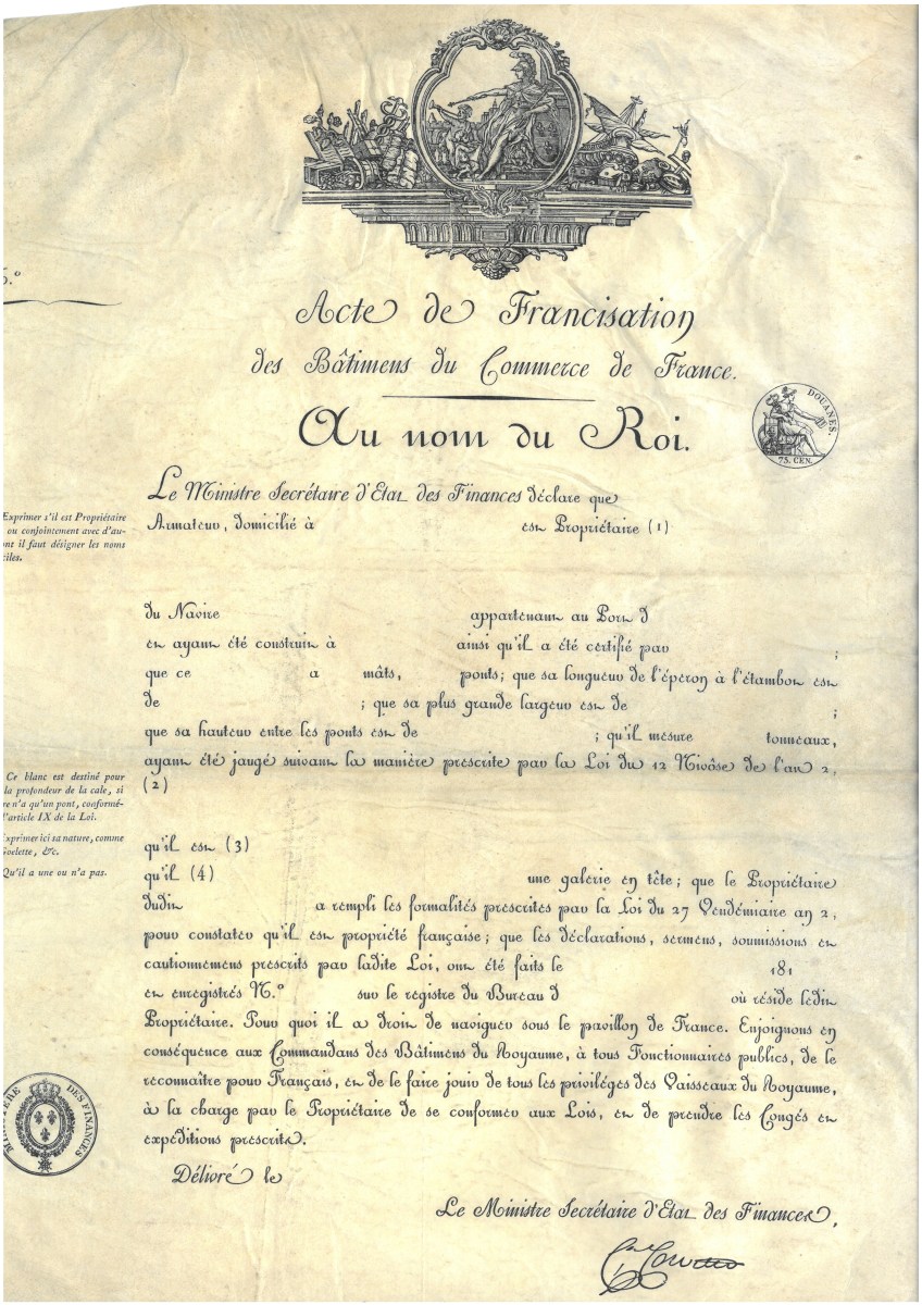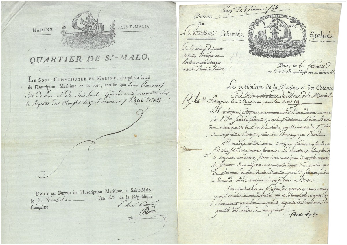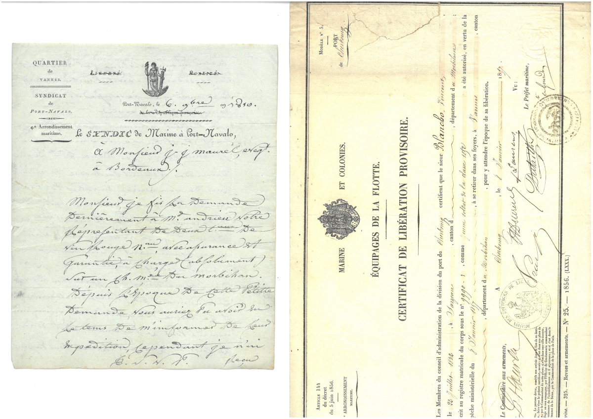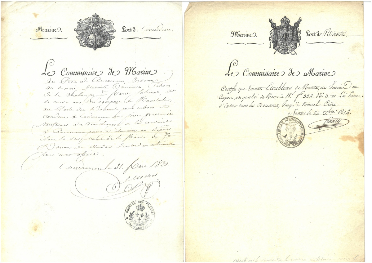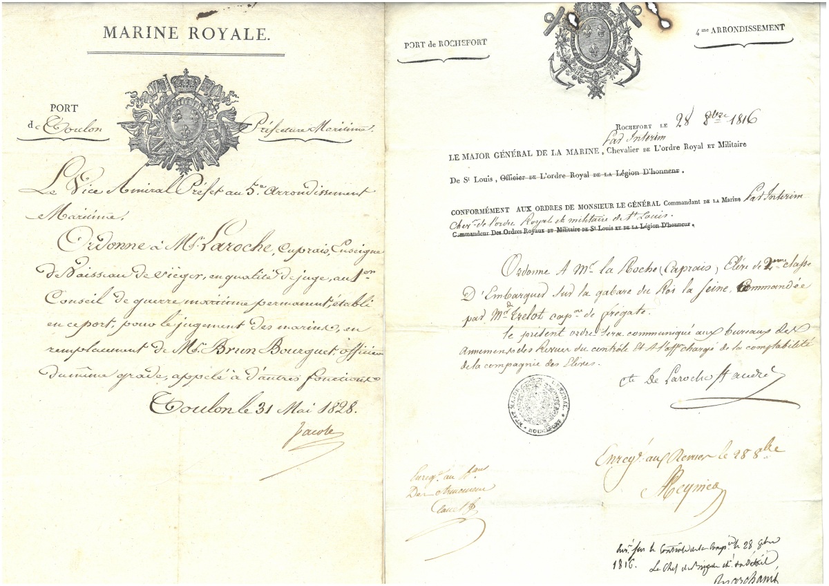 ", en-tête, cachet rouge - Compte d'armement du brick " L'Uni ", capitaine Peytavin, parti du port de Nantes à destination de Cayenne, 1808, 7 pages impr. in-fol. - 7 L.S. de ministres de la marine et des colonies: Georges-René Pléville LE PELLEY (1726-1805) (1797 avec superbe vignette " Liberté des mers "), Denis DECRÈS (1761-1820) (1811 2 L.S. dont une contresignée de Gilbert-Amable FAURE-CONAC commandant de l'école de marine de Brest), Jacques Claude comte BEUGNOT ((1761-1835) (1815), Laurent GOUVION marquis de Saint Cyr (1764-1830) (1817), Henri comte de RIGNY (1782-1835) (1832), Claude du Campe de ROSAMEL (1774-1848) (1836) - L.S. d'Edouard BARRERA (1836-1903) (1897), vice-amiral - L.S. de l'inscription maritime du port de Saint Malo, 7 ventôse an XIII (28 février 1805), en-tête " Quartier de Saint Malo " et jolie vignette - L.S. de l'inscription maritime du port de Dunkerque, 6 juillet 1813, vignette et cachet - 8 L.S. du contre-amiral major général du port de Brest, 1835-1845 - Extrait mortuaire du registre de l'hôpital roayl de la marine du port de Brest, 1781 - L.S. d'Yves LE COAT DE SAINT-HAOUEN (1756-1826), contre-amiral et major général du port de Brest (1816) - L.S. du chevalier de KERLERN, Brest, 1820 - 7 L.S. des préfets maritimes et autres officiers du port de Toulon, 1828-1830 - 13 L.S. des préfets maritimes et officiers du port de Rochefort, 1816-1834 - L.A.S. de Port-Navalo, 6 novembre 1810, en-tête et vignette - Certificat de libération provisoire délivré au port de Cherbourg en 1857 - L.A.S. du commissaire de marine, port de Concarneau, 31 mars 1820, en-tête, vignette et cachet - L.S. du commissaire de marine du port de Nantes, 1814 - Acte de francisation des bâtiments du commerce de France, parchemin, superbe vignette - 2 congés des bâtiments de commerce français, 1825 - etc.