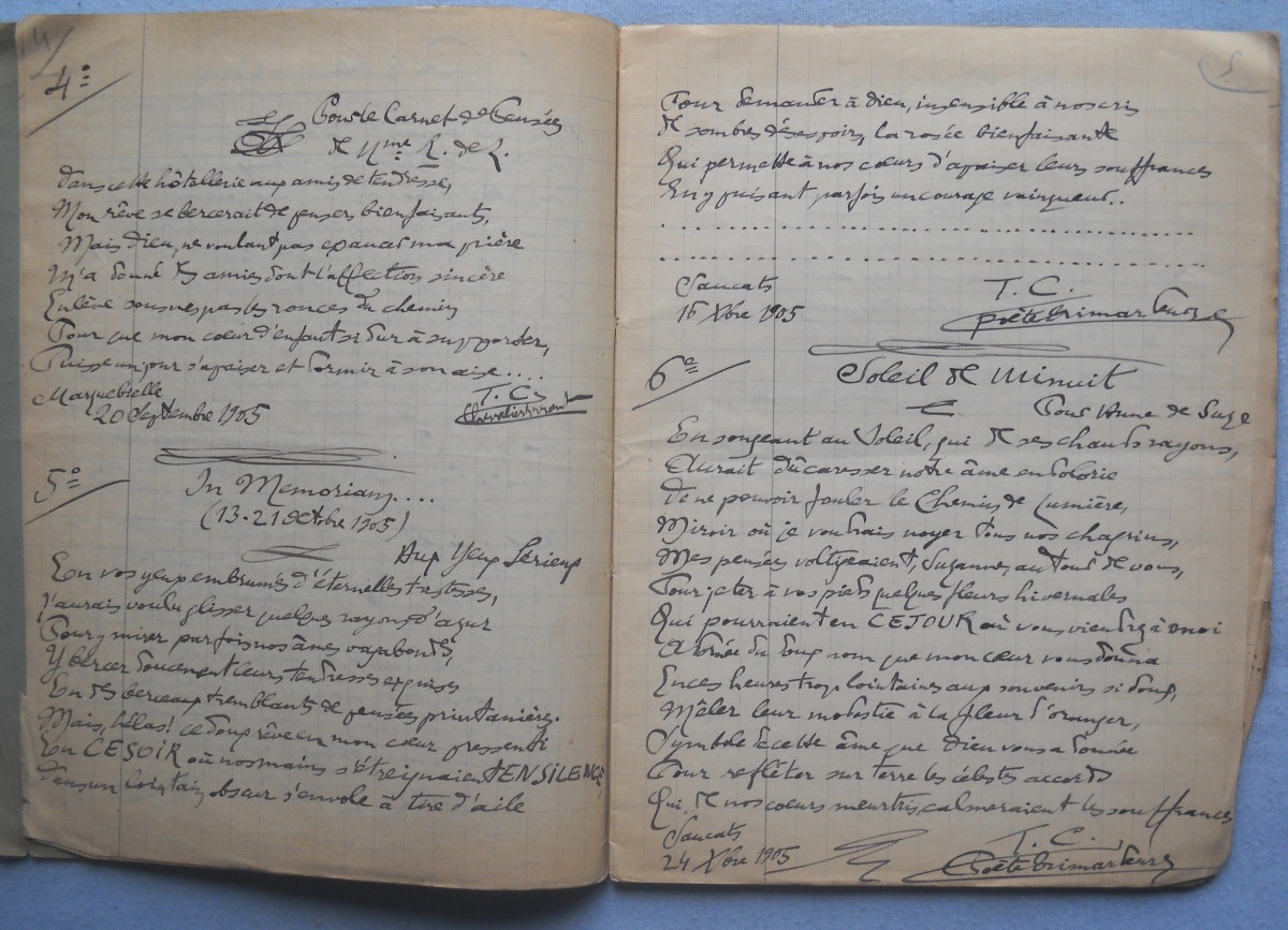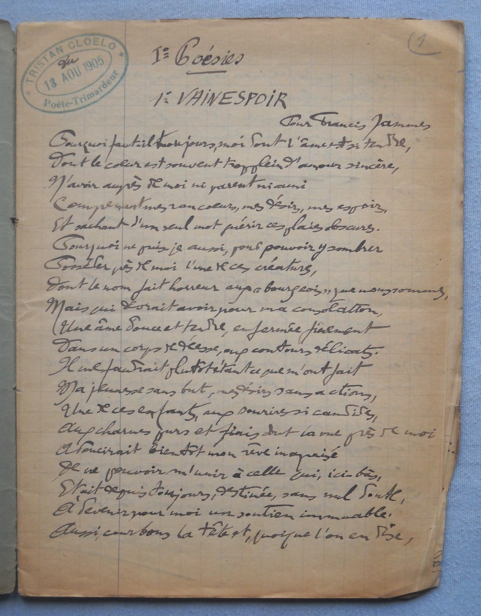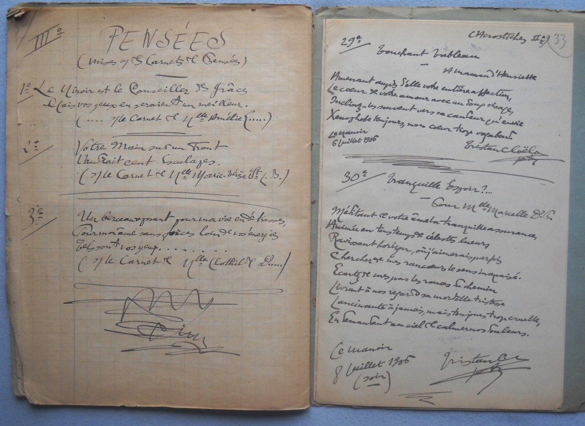 1 cahier d'écolier contenant des poèmes, pensées et acrostiches écrits par " Tristan Cloëlo le poète-Trimardeur " et 5 L.A.S., 1 lettre dactylographiée, datées de 1906 et adressés par Elie LEON-DUFOUR à Léon CHAMBOISSIER, tous deux membres de la société " Le Vieux Papier ", association fondée à Paris en 1900. Elie Leon-Dufour est un bibliophile, illustrateur, collectionneur et un poète écrivant sous le pseudonyme du " Chevalier-errant Tristan Cloëlo ".