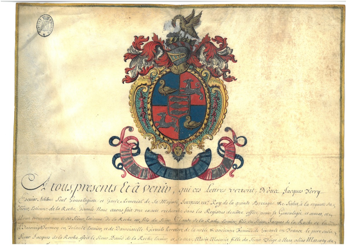 Certificat généalogique sur parchemin délivré et signé par Jacques Terry Athlone garde armorial de Jacques III roi de la Grande-Bretagne, orné du blason peint de la famille de la Roche, cachet du cabinet d'Hozier, 1712, 53 x 39 cm.
