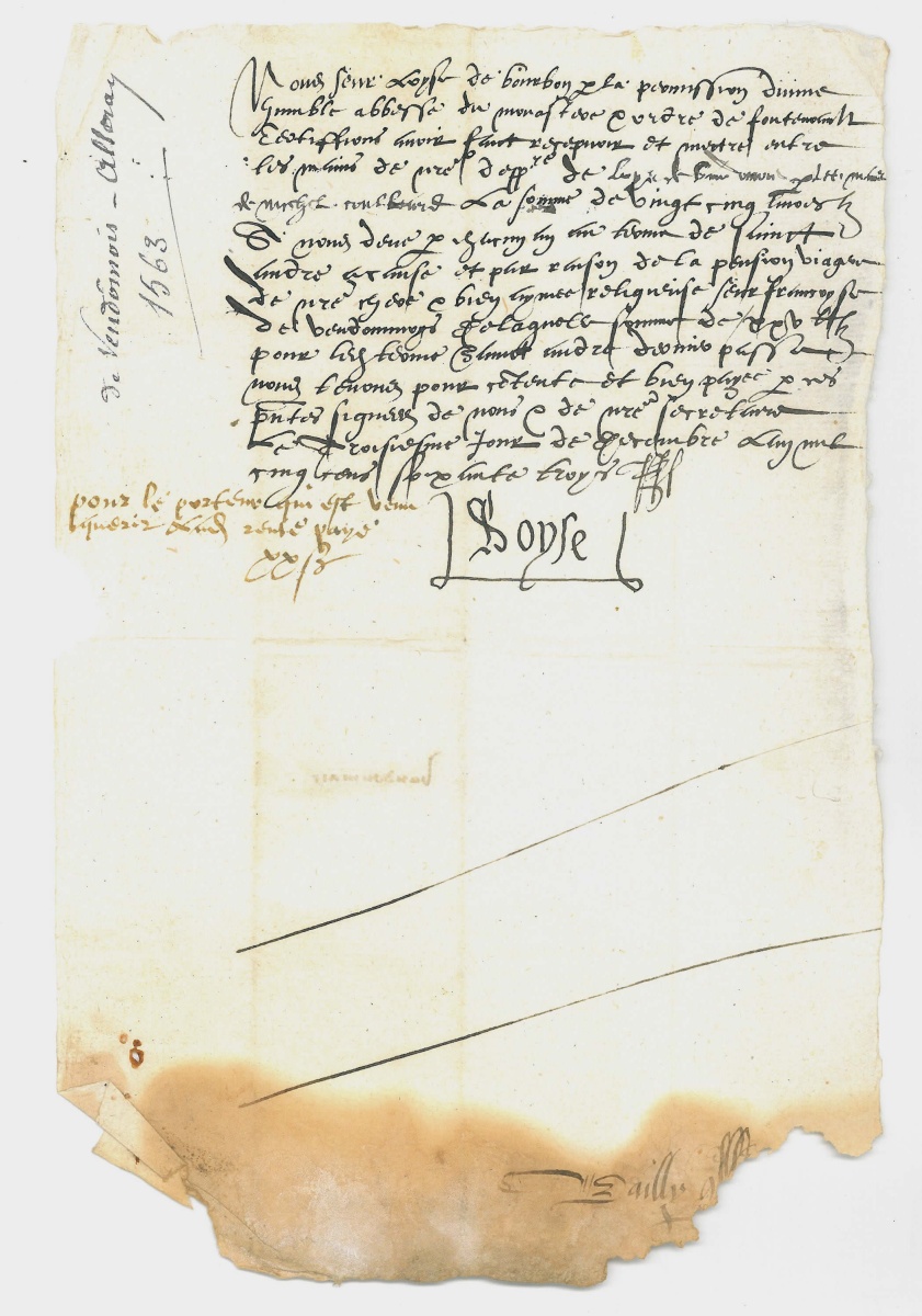 P.S. " Loyse ", Louise de Bourbon, abbesse de l'abbaye royale de Fontevraud, 3 septembre 1563, ½ page in-4. Quittance remise à Louis de Vendômois, seigneur d'Alleray, pour la pension de sa fille Françoise, religieuse au monastère de Fontevraud.