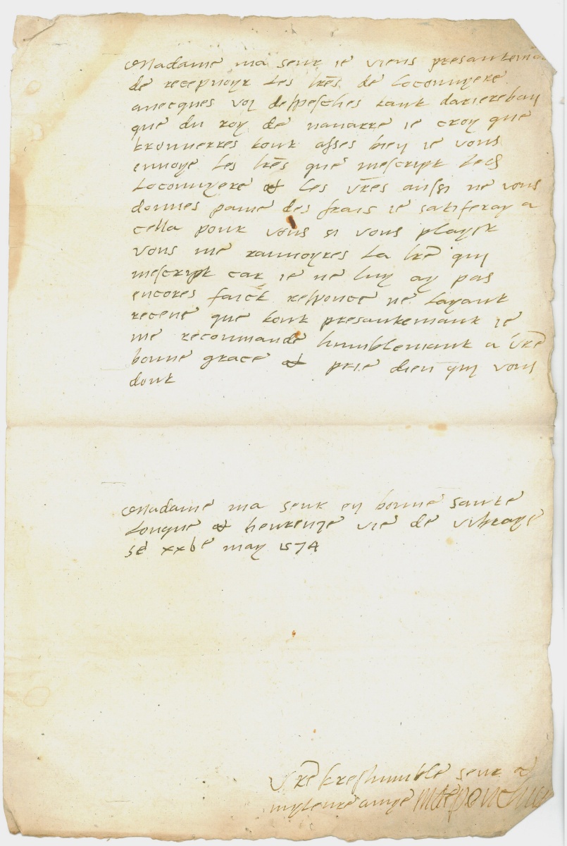 4 pièces manuscrites relatives à la famille Hurault de Vibraye dont L.A.S. de Marguerite Poncher, épouse de Jacques Hurault, grand audiencier du roi, de Vibraye du 20 mai 1574, adressée à sa sur, épouse du seigneur d'Alleray - 2 mandements de justice, 1585.